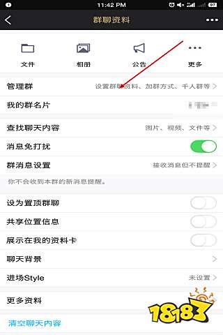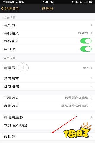 4、在“管理群”界面的往下拉,会看见一个“转让群”,我们点击它。