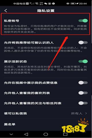 5、进入到隐私设置界面后,将私密账号后面的开关开启,就可以禁止评论了,如下图。