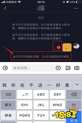 2、此时我们发私信给好友,我们发出的私信前会出现红色感叹号,同时页面出现提示“由于对方的隐私设置,TA无法收到你的消息”,如下图。