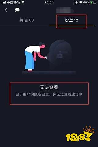8、再点击右侧好友的“粉丝”,页面同样显示“无法查看,由于用户的隐私设置,你无法查看此信息”,如下图。