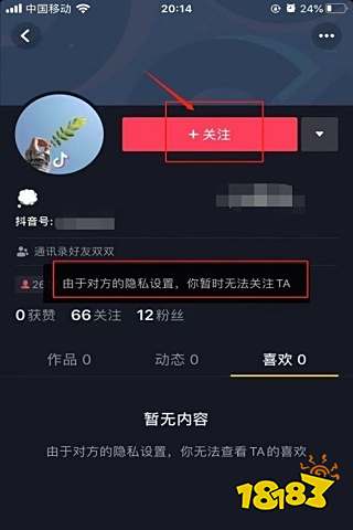 9、最后,我们尝试重新关注拉黑我们的好友,页面出现提示消息:“由于对方的隐私设置,你暂时无法关注TA”,如下图。