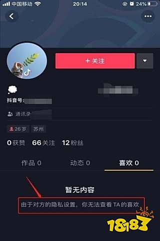 4、进入到抖音好友的主页之后,我们查看好友作品,页面显示“由于对方隐私设置,你无法查看TA的作品”,如下图。