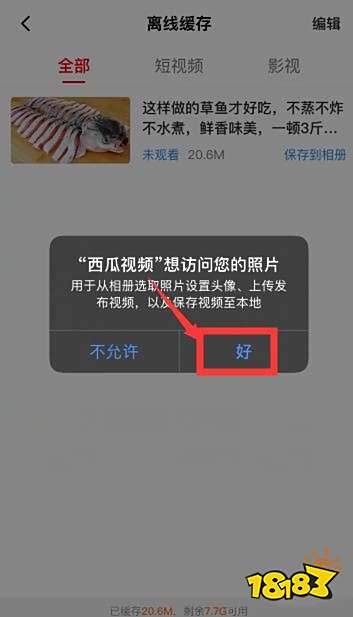 第七步:弹框提示,西瓜视频要访问您的相册,点击“好”即可保存视频到本地相册。