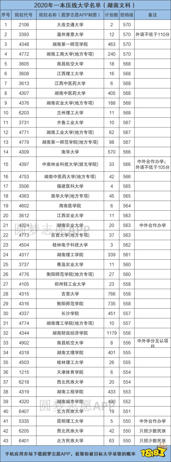 小编根据湖南省教育考试院公布的国内一本大学2020年在湖南文科的录取分数线,为大家整理了收分在一本线上0~20分之内的大学名单,共计43所,供同学们参考!