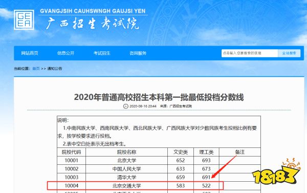 以广西省2020年本科一批投档结果为例,一名高考分数为522的考生成功冲进了。北京交通大学不仅是211大学,还于2017年入选世界一流学科建设高校。2019年,学校在广西省的理科最低录取分数线为620分,2020年这名捡漏的考生可以算是非常幸运了。