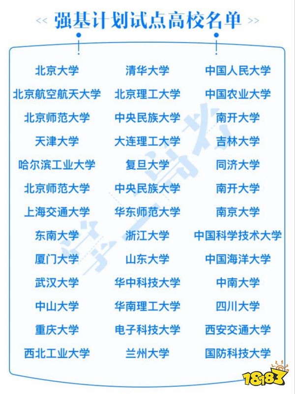 基础学科招生改革试点,也称强基计划,是教育部开展的招生改革工作。2020年1月13日,《教育部关于在部分高校开展基础学科招生改革试点工作的意见》印发,决定自2020年起,在部分高校开展基础学科招生改革试点。