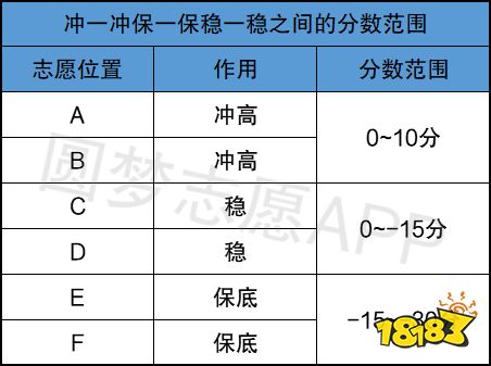 说明:以上冲一冲 、 保一保 、 稳一稳之间的分数范围是大众比较普遍认可的,但也因个人情况不同可小幅度上下浮动一点;冲高、稳、保底的志愿个数也可根据自身意愿进行调整。