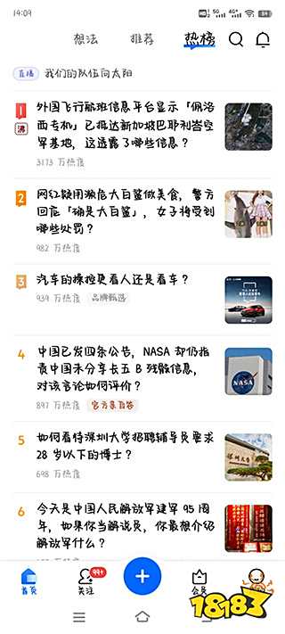 2、进入首页,包含“推荐”“想法”和“热榜”页面,可以选择自己喜欢的话题进行阅读。