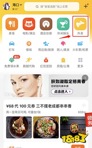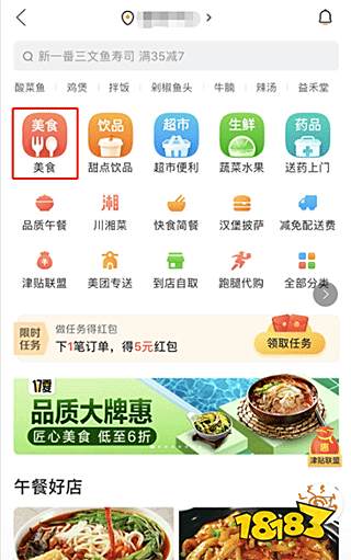 2、进入外卖页面后,可以看到有各种外卖服务,以‘美食’为例子,点击,