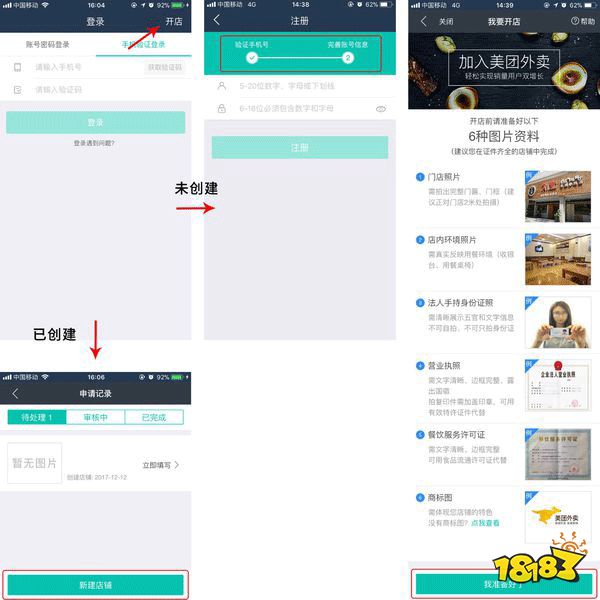 2、打开美团外卖商家版App,点击右上角#开店#进行基本注册,填写您的手机号和设置登陆账号信息,完成基本注册后自动跳转美团外卖#我要开店#页面,详读页面提示后点击底部#我准备好了#;如果您已经创建过基本注册,可直接登录并在登录后点击底部#新建店铺#。