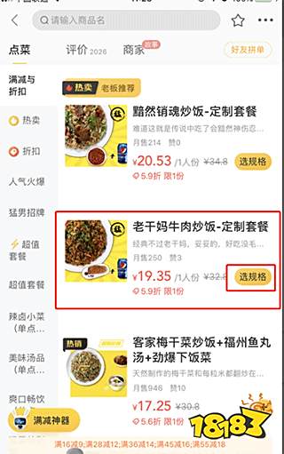 4、选择一家,然后自己比较喜欢吃的美食,点击选择‘规格’或者没有规格的直接加入到购物车里,