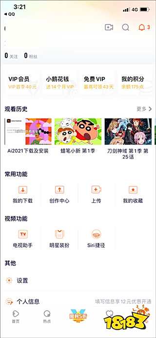 5、个人中心是管理本身账号的地方,有着、观看历史、常用功能、视频功能、设置、个人信息、VIP会员等等。