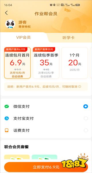 1个月(作业帮连续包月VIP)、3个月(作业帮连续包季VIP)、12个月(作业帮连续包年VIP)