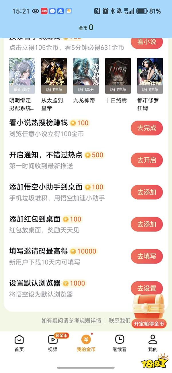 1、 悟空浏览器可通过刷资讯、看视频等途径获取金币。
