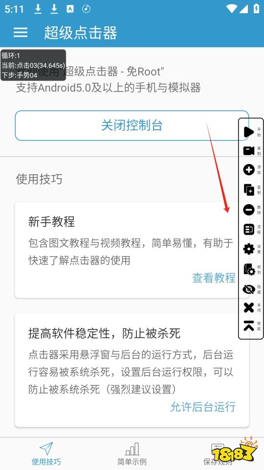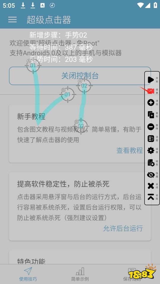 5、完成上述设置后,点击悬浮窗中的开始按钮,超级点击器就会按照设定的步骤和参数自动执行点击或其他操作