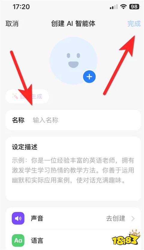 4、输入名称后,点击右上角【完成】即可创建AI智能体。