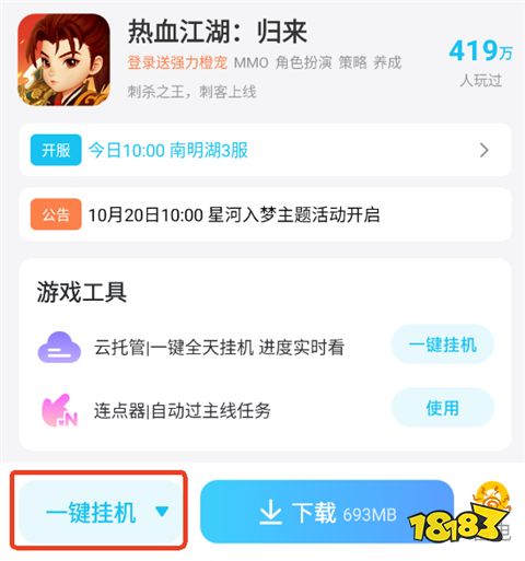 2、点击【一键挂机】,每日都可免费领取云手机挂机时长,自动安装同款游戏,同时长内不限游戏体验个数。