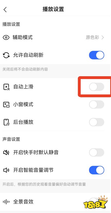 4、点击【自动上滑】右边的滑动按钮打开这个选项,打开后视频播放完毕会自动播放下一个视频。