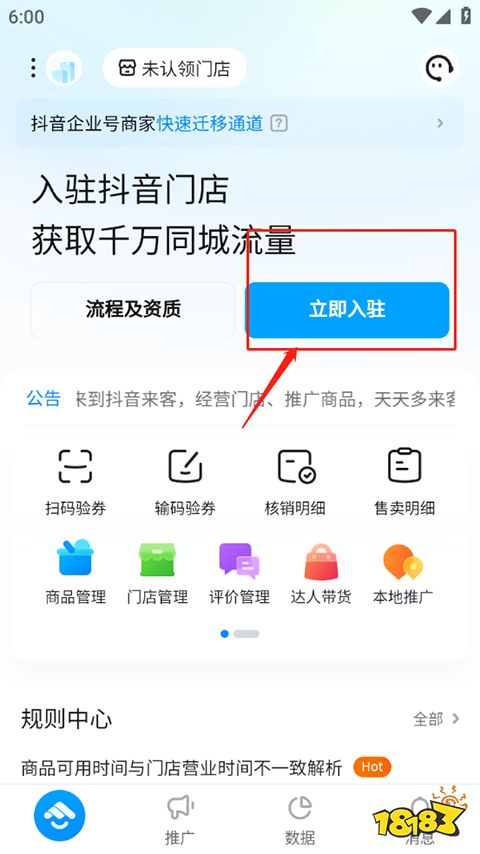 1、在本站下载安装抖音来客商家版app,进入抖音来客首页,点击【入驻抖音门店】。