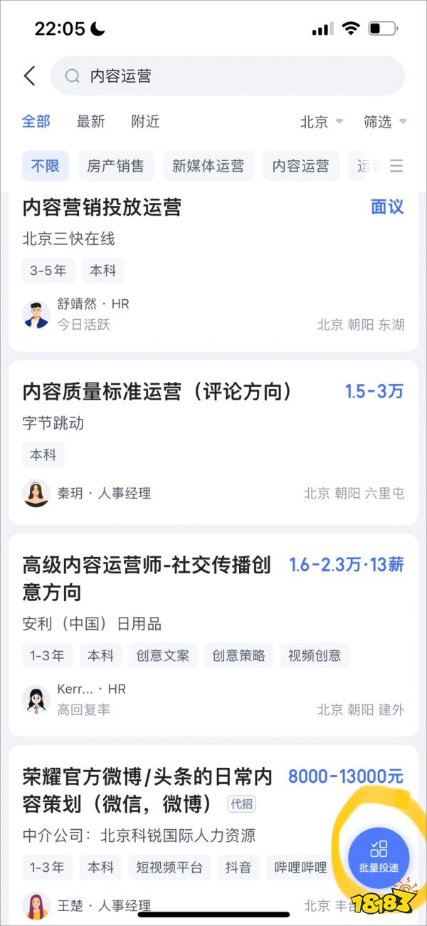 1、在首页的“搜索栏”里输入“职位”,如内容运营,然后右下角会出现“批量投递”的蓝色小圈圈,点它