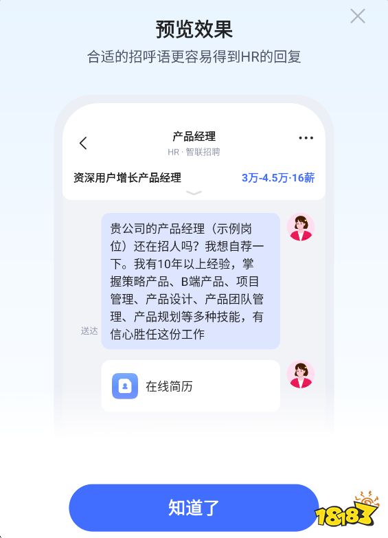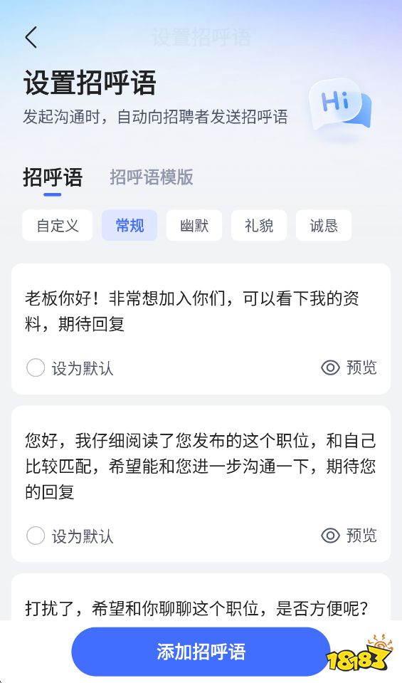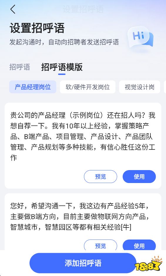 4、也提供了针对不同岗位的打招呼语模板,比如产品经理岗、视觉设计岗、运营岗等等。
