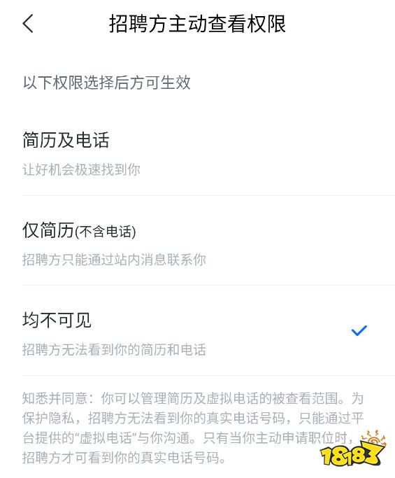 4、选择均不可见就可以了,这样招聘方就看不了你的简历和电话了。