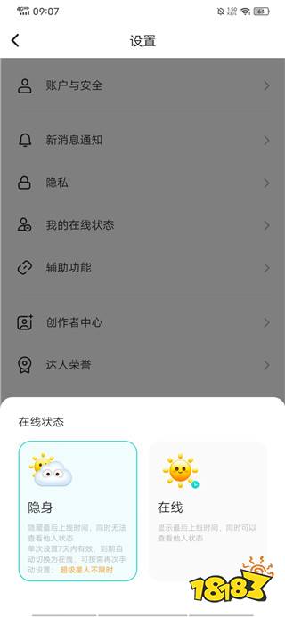 4、在下方弹出的页面中选择【隐身】即可完成设置。