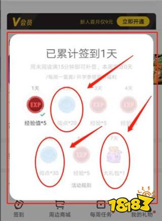每周可以签到7天,在第2天、第5天、第7天签到时都可以领取阅点