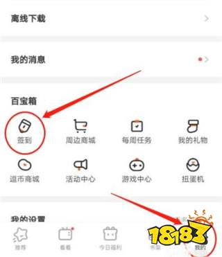 打开“腾讯动漫” APP,在界面下方点击右下角的“我的”,再点击“百宝箱”栏下的“签到”图标