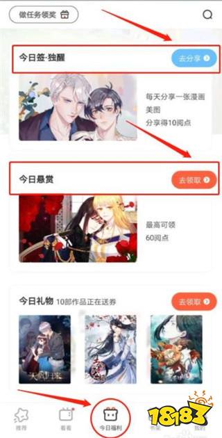 3. 每日签到做任务送豪礼,每周任务更新阅读漫画就能获得经验值,任务奖励新增阅点和月票碎片