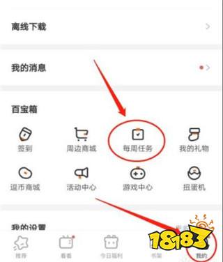 在“腾讯动漫” APP界面下方点击右下角的“我的”,再点击“百宝箱”栏下的“每周任务”图标