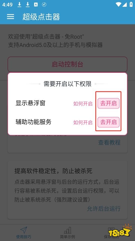 1、打开点击器app,通常会提示需要开通显示悬浮窗”功能和辅助功能权限。根据系统提示,将这两个权限设置为允许或打开状态