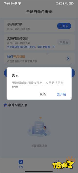 1、下载进入自动点击器app,在主页中你需要开启悬浮窗权限和无障碍服务权限;