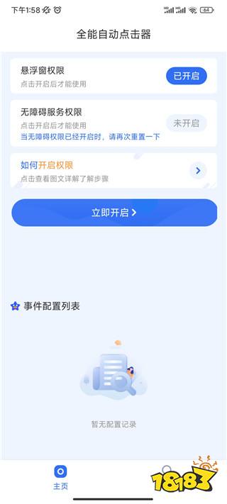1、下载进入自动点击器app,在主页中你需要开启悬浮窗权限和无障碍服务权限;