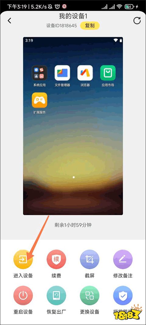 进入到这个云手机的界面后我们可以对它进行非常多的操作,如果我们要进入这个手机的话点击进入设备就可以了。