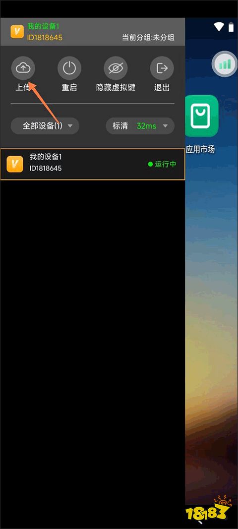 用我们进入到云手机界面点击悬浮球,这个时候我们在弹出来的列表中找到并点击【上传】。