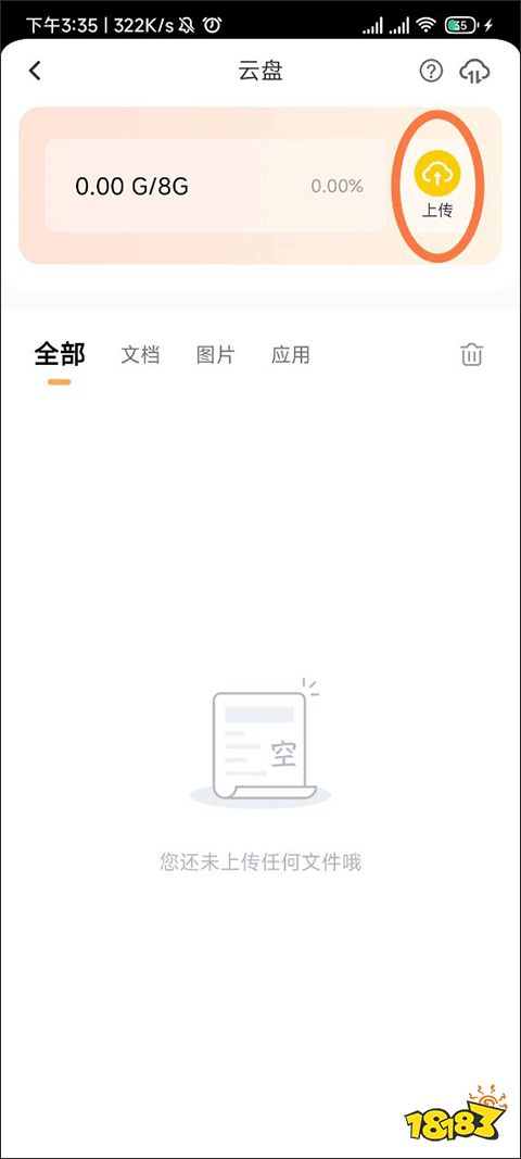 这个时候我们就会进入【云盘】界面,我们再次点击主页内的上传。