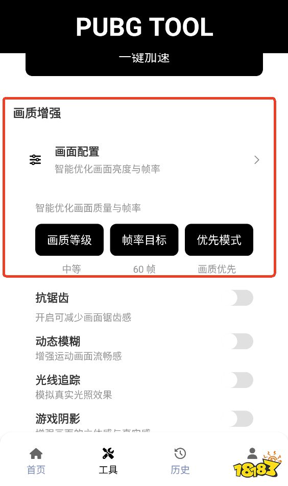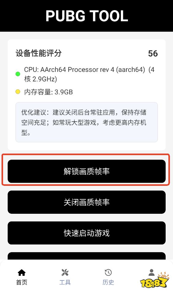 1、下载完成之后打开PUBGTool2026最新版软件,点击解锁画质帧率。