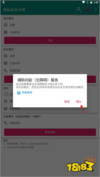 (1)打开app之后页面上弹出了一个小窗口,上面显示“此应用需要激活无障碍服务才能正常工作……”,看完就可以点击下方的“确认”按钮;