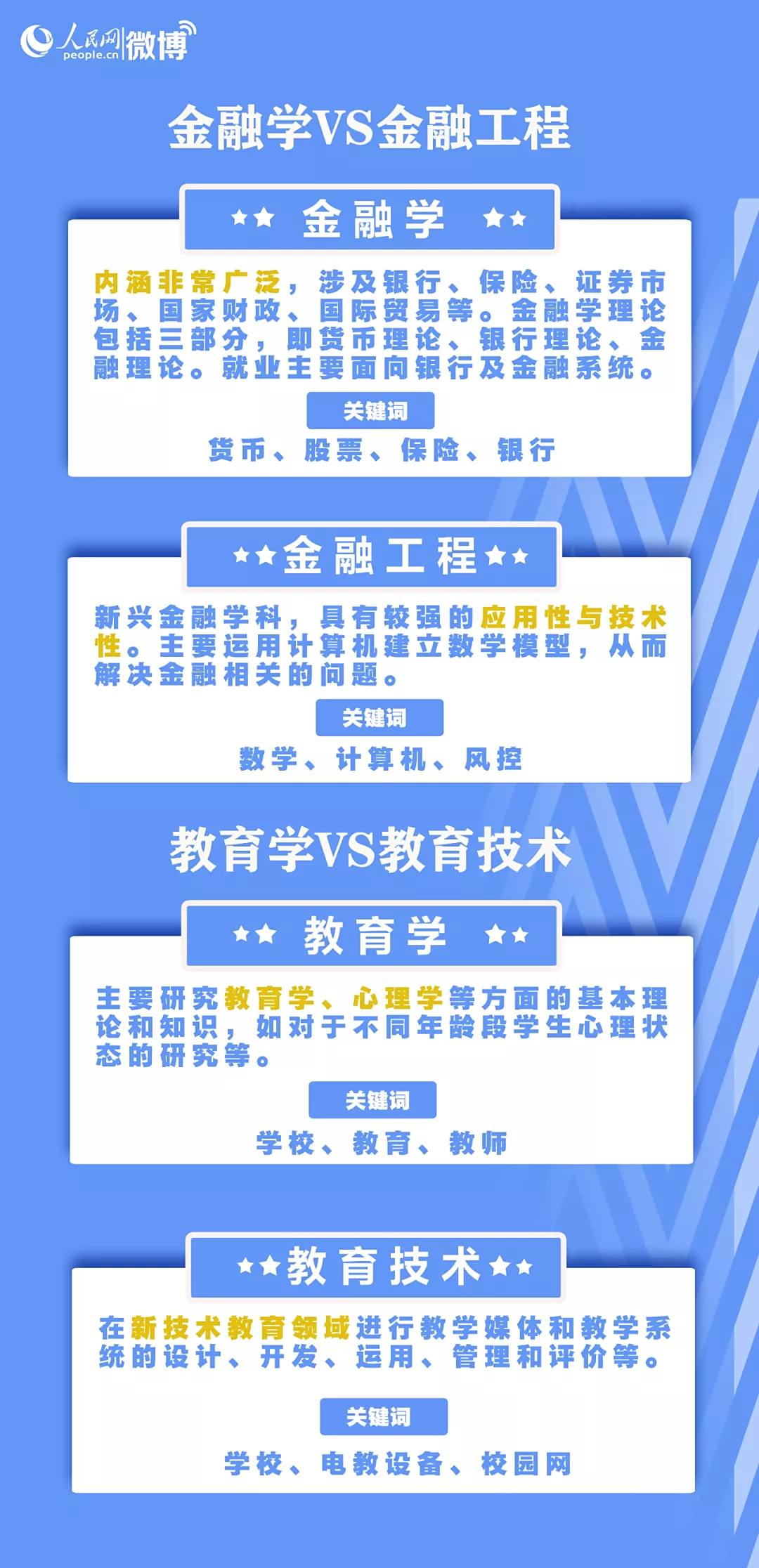 很多专业名称相似,但学习内容、就业方向却大有不同!金融学、金融工程;社会学、社会工作;数字媒体技术、数字媒体艺术……在此整理了18组名称相似却大有不同的专业,填志愿前务必弄清楚哦↓↓↓