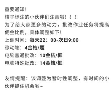 橘子标注赚钱是真的吗?橘子标注是原本橘子兼职,最近才该的名字。对于橘子兼职,之前小编就写过一篇文章,介绍了zq速度咋样,该如何玩。今天平台推送了一个公告,说是批改作业部分,奖励增加啦。可以看下平台的公告,正好也顺便给大家说一说,这个批改作业的价格,我们能不能玩。