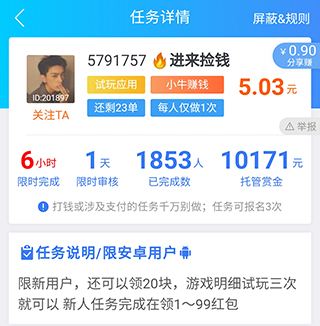 今日在悬赏任务平台做任务的时候,发现有人在发小牛赚钱的任务单,看到佣金有5元,觉得还不错就点进去准备做。看了下任务要求,也不是很难,就是在小牛赚钱试玩3次游戏就可以挣到5元钱,...