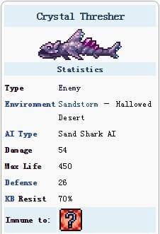 水晶沙鲨是在困难模式下的怪物,在神圣化的沙漠沙尘暴事件中生成,它可以在沙块中游动,当它发现玩家后,会跳离沙块进行攻击。