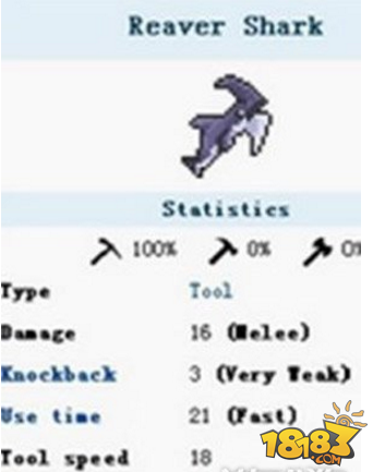 可以挖(钴/钯)相当于熔岩镐。鲨鱼镐可以通过海洋钓鱼获得。 它比熔融镐采矿速度快了30%。是不错的镐子(获得容易)