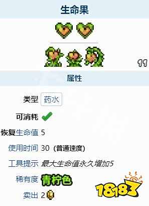 泰拉瑞亚生命果作用介绍:一旦使用生命果,玩家将会永久增加 5 点生命值,且使得玩家生命值中的一个红色的心变成金色。