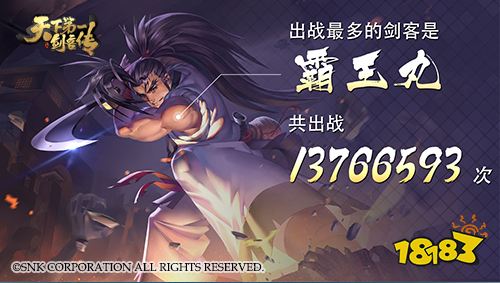 出战最多的剑客是霸王丸,共出战13766593次,看来霸王丸不但是《天下第一剑客传》的主角,还是个劳模啊,人气高,没办法。