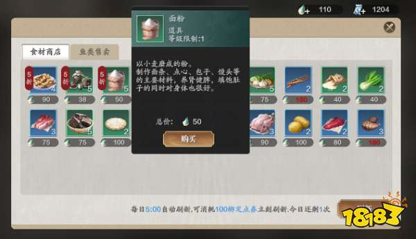 制作白饼需要消耗面粉,玩家们可以在食材商店消耗鱼鳞购买到面粉。鱼鳞可以出售钓到的鱼获得。