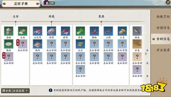 学会制作白饼后,玩家们就可以打开菜单>身份>厨师界面,选择烹饪,并切换到食材信息界面。
