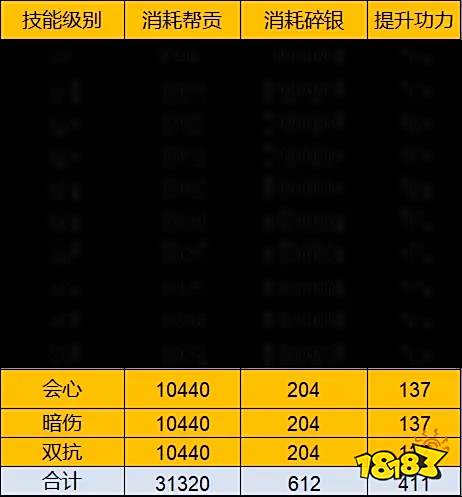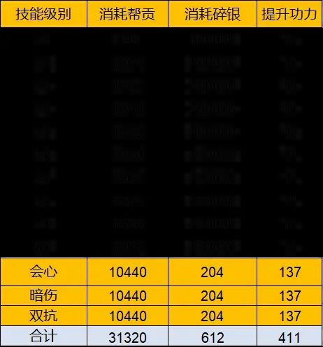 单个技能消耗7620点帮贡,304800碎银,带来269点功力提升。