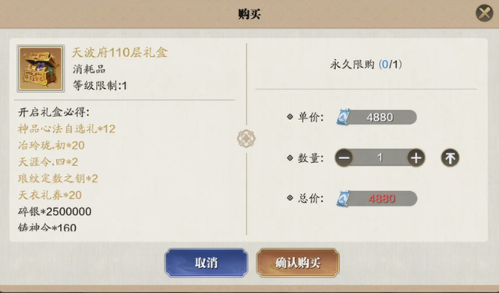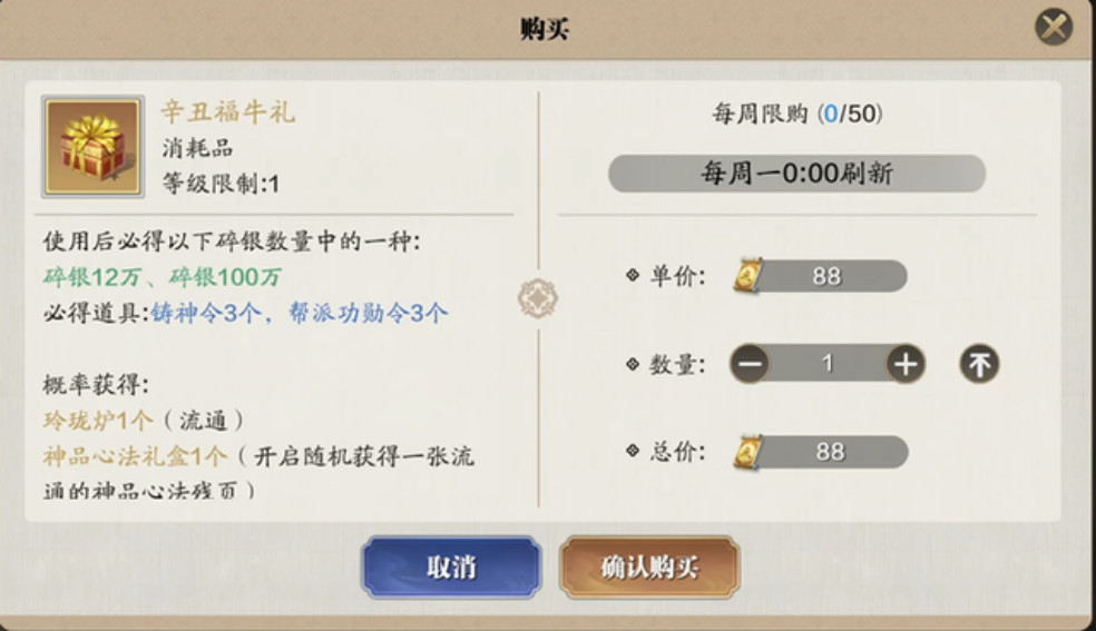 辛丑福牛礼盒是现阶段花费点券换碎银最快的方式。对于小中氪的玩家来说是福音,每周上限50个。每次保底12W,有几率开出100W。